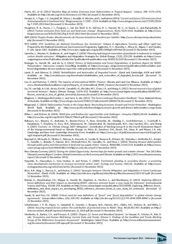 Harris, N.L. et al. (2012) ‘Baseline Map of Carbon Emissions from Deforestation in Tropical Regions’. Science, 336: 1573–1576. Available at: http://dx.doi.org/10.1126/science.1217962 [Accessed 11 November 2015]. Hooijer A., S. Page, J. G. Canadell, M. Silvius, J. Kwadijk, H. Wösten, and J. Jauhiainen (2010) ‘Current and future CO2 emissions from drained peatlands in Southeast Asia’. Biogeosciences, 7: 1505 – 1514. Available at: http://www.biogeosciences.net/7/1505/2010/ bg-7-1505-2010.html [Accessed 11 November 2015]. Houghton, R. A., House, J. I., Pongratz, J., van der Werf, G. R., DeFries, R. S., Hansen, M. C., Le Quéré, C., and Ramankutty, N. (2012) ‘Carbon emissions from land use and land-cover change’. Biogeosciences, 9(12): 5125-5142. Available at: http://www. biogeosciences.net/9/5125/2012/bg-9-5125-2012.html [Accessed 11 November 2015]. INPE (2015) ‘Projeto Prodes: Monitoramento da Floresta Amazônica Brasileira por Satélite’. http://www.obt.inpe.br/prodes/index. php [Accessed 11 November 2015]. IPCC (2006) ‘IPCC Guidelines for National Greenhouse Gas Inventories’. Volume 4: Agriculture, Forestry and Other Land Use. Prepared by the National Greenhouse Gas Inventories Programme, Eggleston, H. S., Buendia, L., Miwa, Ki., Ngara, T. and Tanabe, K. eds. Japan: IGES. Available at: http://www.ipcc-nggip.iges.or.jp/public/2006gl/vol4.html [Accessed 11 November 2015]. Jaenicke, J., Wösten, H., Budiman, A., and Siegert, F. (2010) ‘Planning hydrological restoration of peatlands in Indonesia to mitigate carbon dioxide emissions’. Mitigation and Adaptation Strategies for Global Change, 15(3): 223-239. Available at: https://www. wageningenur.nl/en/Publication-details.htm?publicationId=publication-way-343031313233 [Accessed 11 November 2015]. Kissinger, G., Herold, M., and de Sy, V. (2012) ‘Drivers of Deforestation and Forest Degradation: A Synthesis Report for REDD+ Policymakers’. Vancouver: Lexeme Consulting. Available at: https://www.gov. uk/government/publications/deforestation-andforest-degradation-drivers-synthesis-report-for-redd-policymakers [Accessed 11 November 2015]. Lamb, D. and Gilmour, D. (2003) ‘Rehabilitation and Restoration of Degraded Forests’. Gland and Cambridge: IUCN and WWF. Available at: http://cmsdata.iucn.org/downloads/rehabilitation_and_restoration_of_degraded_forests.pdf [Accessed 11 November 2015]. Lee, D. and Pistorius, T. (2015) ‘The Impacts of International REDD+ Finance’. Climate and Land Use Alliance. Available at: http:// www.climateandlandusealliance.org/en/Impacts_of_International_REDD_Finance/ [Accessed 11 November 2015]. Liu, Y.Y., van Dijk, A.I.J.M., de Jeu, R.A.M., Canadell, J.G., McCabe, M.F., Evans, J.P., and Wang, G. (2015) ‘Recent reversal in loss of global terrestrial biomass’. Nature Climate Change, 5:470–474. Available at: http://www.researchgate.net/publication/281887147_ Recent_reversal_in_loss_of_global_terrestrial_biomass [Accessed 11 November 2015]. Maginnis, S., Rietbergen-McCracken, J., and Sarre, A. eds. (2012) ‘The Forest Landscape Restoration Handbook’. Trove, National Library of Australia. Available at: http://trove.nla.gov.au/work/25061115?q&versionId=208466756 [Accessed 11 November 2015]. Megevand, C. (2013) ‘Deforestation Trends in the Congo Basin: Reconciling Economic Growth and Forest Protection’. Washington: World Bank. Available at: http://www.profor.info/knowledge/economic-growth-and-drivers-deforestation-congo-basin [Accessed 11 November 2015]. Miles, L. and Dickson, B. (2010) `REDD-plus and biodiversity: opportunities and challenges’. Unasylva 236(61):56-63. Available at: http://www.fao.org/docrep/013/i1758e/i1758e14.pdf [Accessed 11 November 2015]. Nabuurs, G.J., Masera, O., Andrasko, K., Benitez-Ponce, P., Boer, Dutschke, M., Elsiddig, E., Ford-Robertson, J., Frumhoff, P., Karjalainen, T., Krankina, O., Kurz, W.A., Matsumoto, M., Oyhantcabal, W., Ravindranath, N.H., Sanz Sanchez, M.J., and Zhang X. (2007) ‘Forestry’. In ‘Climate Change 2007: Mitigation’. Contribution of Working Group III to the Fourth Assessment Report of the Intergovernmental Panel on Climate Change. In: Metz, B., Davidson, O.R., Bosch, P.R., Dave, R. and Meyer, L.A. eds. Cambridge and New York: Cambridge University Press. Available at: https://www.ipcc.ch/pdf/assessment-report/ar4/wg3/ar4wg3-chapter9.pdf [Accessed 11 November 2015]. Nepstad, D., McGrath, D., Stickler, C., Alencar, A., Azevedo, A., Swette, B., Bezerra, B., DiGiano, M., Shimada, J., da Motta, R.S., Armijo, E., Castello, L., Brando, P., Hansen, M.C., McGrath-Horn, M., Carvalho, O., and Hess, L. (2014) ‘Slowing Amazon deforestation through public policy and interventions in beef and soy supply chains’. Science, 344(6188), 1118-1123. Available at: https://www. sciencemag.org/content/344/6188/1118.figures-only [Accessed 11 November 2015]. New Climate Economy (2015) ‘Seizing the Global Opportunity. Partnerships for better growth and a better climate’. The 2015 New Climate Economy Report. London: Global Commission on the Economy and Climate. Available at: http://2015.newclimateeconomy. report/ [Accessed 11 November 2015]. Paquette, A., Hawryshyn, J., Vyta Senikas, A. and Potvin, C. (2009) ‘Enrichment planting in secondary forests: a promising clean development mechanism to increase terrestrial carbon sinks’. Ecology and Society, 14(1):31. Available at: http://www. ecologyandsociety.org/vol14/iss1/art31/ [Accessed 11 November 2015]. Rizvi, A.R., Baig, S., Barrow, E., and Kumar, C. (2015) ‘Synergies between Climate Mitigation and Adaptation in Forest Landscape Restoration’. Gland: IUCN. Available at: https://portals.iucn.org/library/sites/library/files/documents/2015-013.pdf [Accessed 11 November 2015]. Romijn, E., Ainembabazi, J.H., Wijaya, A., Herold, M., Angelsen, A., Verchot, L., and Murdiyarso, D. (2013) ‘Exploring different forest definitions and their impact on developing REDD+ reference emission levels: a c