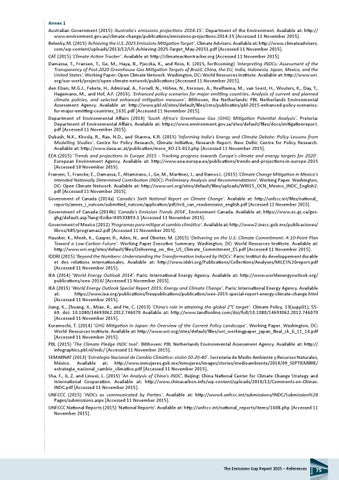 Annex 1 Australian Government (2015) ‘Australia’s emissions projections 2014-15’. Department of the Environment. Available at: http:// www.environment.gov.au/climate-change/publications/emissions-projections-2014-15 [Accessed 11 November 2015]. Belenky, M. (2015) ‘Achieving the U.S. 2025 Emissions Mitigation Target’. Climate Advisers. Available at: http://www.climateadvisers. com/wp-content/uploads/2013/12/US-Achieving-2025-Target_May-20151.pdf [Accessed 11 November 2015]. CAT (2015) ‘Climate Action Tracker’. Available at: http://climateactiontracker.org [Accessed 11 November 2015]. Damassa, T., Fransen, T., Ge, M., Haya, B., Pjeczka, K., and Ross, K. (2015, forthcoming) ‘Interpreting INDCs: Assessment of the Transparency of Post-2020 Greenhouse Gas Mitigation Targets of Brazil, China, the EU, India, Indonesia, Japan, Mexico, and the United States’. Working Paper: Open Climate Network. Washington, DC: World Resources Institute. Available at: http://www.wri. org/our-work/project/open-climate-network/publications [Accessed 11 November 2015]. den Elzen, M.G.J., Fekete, H., Admiraal, A., Forsell, N., Höhne, N., Korosuo, A., Roelfsema, M., van Soest, H., Wouters, K., Day, T., Hagemann, M., and Hof, A.F. (2015). ‘Enhanced policy scenarios for major emitting countries. Analysis of current and planned climate policies, and selected enhanced mitigation measure’. Bilthoven, the Netherlands: PBL Netherlands Environmental Assessment Agency. Available at: http://www.pbl.nl/sites/default/files/cms/publicaties/pbl-2015-enhanced-policy-scenariosfor-major-emitting-countries_1631.pdf [Accessed 11 November 2015]. Department of Environmental Affairs (2014) ‘South Africa’s Greenhouse Gas (GHG) Mitigation Potential Analysis’. Pretoria: Department of Environmental Affairs. Available at: https://www.environment.gov.za/sites/default/files/docs/mitigationreport. pdf [Accessed 11 November 2015]. Dubash, N.K., Khosla, R., Rao, N.D., and Sharma, K.R. (2015) ‘Informing India’s Energy and Climate Debate: Policy Lessons from Modelling Studies’. Centre for Policy Research, Climate Initiative, Research Report. New Delhi: Centre for Policy Research. Available at: http://www.iiasa.ac.at/publication/more_XO-15-012.php [Accessed 11 November 2015]. EEA (2015) ‘Trends and projections in Europe 2015 - Tracking progress towards Europe’s climate and energy targets for 2020’. European Environment Agency. Available at: http://www.eea.europa.eu/publications/trends-and-projections-in-europe-2015 [Accessed 10 November 2015]. Fransen, T., Francke, E., Damassa, T., Altamirano, J., Ge, M., Martinez, J., and Ramos L. (2015) ‘Climate Change Mitigation in Mexico’s Intended Nationally Determined Contribution (INDC): Preliminary Analysis and Recommendations’. Working Paper. Washington, DC: Open Climate Network. Available at: http://www.wri.org/sites/default/files/uploads/WRI15_OCN_Mexico_INDC_English2. pdf [Accessed 11 November 2015]. Government of Canada (2014a) ‘Canada’s Sixth National Report on Climate Change’. Available at: http://unfccc.int/files/national_ reports/annex_i_natcom/submitted_natcom/application/pdf/nc6_can_resubmission_english.pdf [Accessed 11 November 2015]. Government of Canada (2014b) ‘Canada’s Emission Trends 2014’, Environment Canada. Available at: https://www.ec.gc.ca/gesghg/default.asp?lang=En&n=E0533893-1 [Accessed 11 November 2015]. Government of Mexico (2012) ‘Programas para mitigar el cambio climático’. Available at: http://www2.inecc.gob.mx/publicaciones/ libros/685/programas2.pdf [Accessed 11 November 2015]. Hausker, K., Meek, K., Gasper, R., Aden, N., and Obeiter, M. (2015) ‘Delivering on the U.S. Climate Commitment: A 10-Point Plan Toward a Low-Carbon Future’. Working Paper Executive Summary. Washington, DC: World Resources Institute. Available at: http://www.wri.org/sites/default/files/Delivering_on_the_US_Climate_Commitment_ES.pdf [Accessed 11 November 2015]. IDDRI (2015) ‘Beyond the Numbers: Understanding the Transformation Induced by INDCs’. Paris: Institut du developpement durable et des relations internationales. Available at: http://www.iddri.org/Publications/Collections/Analyses/MILES%20report.pdf [Accessed 11 November 2015]. IEA (2014) ‘World Energy Outlook 2014’. Paris: International Energy Agency. Available at: http://www.worldenergyoutlook.org/ publications/weo-2014/ [Accessed 11 November 2015]. IEA (2015) ‘World Energy Outlook Special Report 2015: Energy and Climate Change’. Paris: International Energy Agency. Available at: https://www.iea.org/publications/freepublications/publication/weo-2015-special-report-energy-climate-change.html [Accessed 11 November 2015]. Jiang, K., Zhuang, X., Miao, R., and He, C. (2013) ‘China’s role in attaining the global 2°C target’. Climate Policy, 13(supp01), 5569. doi: 10.1080/14693062.2012.746070 Available at: http://www.tandfonline.com/doi/full/10.1080/14693062.2012.746070 [Accessed 11 November 2015]. Kuramochi, T. (2014) ‘GHG Mitigation in Japan: An Overview of the Current Policy Landscape’. Working Paper. Washington, DC: World Resources Institute. Available at: http://www.wri.org/sites/default/files/wri_workingpaper_japan_final_ck_6_11_14.pdf [Accessed 11 November 2015]. PBL (2015) ‘The Climate Pledge INDC tool’. Bilthoven: PBL Netherlands Environmental Assessment Agency. Available at: http:// infographics.pbl.nl/indc/ [Accessed 11 November 2015]. SEMARNAT (2013) ‘Estrategia Nacional de Cambio Climático: visión 10-20-40’. Secretaría de Medio Ambiente y Recursos Naturales, México. Available at: http://www.inmujeres.gob.mx/inmujeres/images/stories/medioambiente/2014/09_SEPTIEMBRE/ estrategia_nacional_cambio_climatico.pdf [Accessed 11 November 2015]. Sha, F., Ji, Z. and Linwei, L. (2015) ‘An Analysis of China’s INDC’. Beijing: China National Center for Climate Change Strategy and International Cooperation. Available at: http://www.chinacarbon.info/wp-conten
