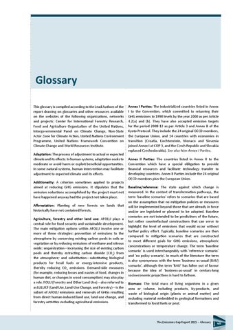 Glossary This glossary is compiled according to the Lead Authors of the report drawing on glossaries and other resources available on the websites of the following organizations, networks and projects: Center for International Forestry Research, Food and Agriculture Organization of the United Nations, Intergovernmental Panel on Climate Change, Non-State Actor Zone for Climate Action, United Nations Environment Programme, United Nations Framework Convention on Climate Change and World Resources Institute. Adaptation: The process of adjustment to actual or expected climate and its effects. In human systems, adaptation seeks to moderate or avoid harm or exploit beneficial opportunities. In some natural systems, human intervention may facilitate adjustment to expected climate and its effects. Additionality: A criterion sometimes applied to projects aimed at reducing GHG emissions. It stipulates that the emission reductions accomplished by the project must not have happened anyway had the project not taken place. Afforestation: Planting of new forests on lands that historically have not contained forests. Agriculture, forestry and other land use: AFOLU plays a central role for food security and sustainable development. The main mitigation options within AFOLU involve one or more of three strategies: prevention of emissions to the atmosphere by conserving existing carbon pools in soils or vegetation or by reducing emissions of methane and nitrous oxide; sequestration—increasing the size of existing carbon pools and thereby extracting carbon dioxide (CO2) from the atmosphere; and substitution—substituting biological products for fossil fuels or energy-intensive products, thereby reducing CO2 emissions. Demand-side measures (for example, reducing losses and wastes of food, changes in human diet, or changes in wood consumption) may also play a role. FOLU (Forestry and Other Land Use)—also referred to as LULUCF (Land Use, Land-Use Change, and Forestry)—is the subset of AFOLU emissions and removals of GHGs resulting from direct human-induced land use, land-use change, and forestry activities excluding agricultural emissions.