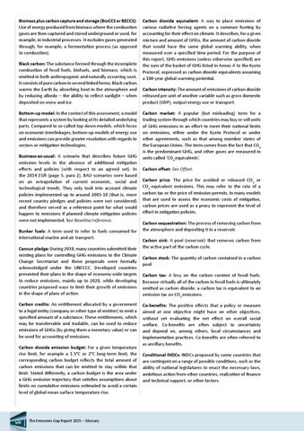 Carbon dioxide equivalent: A way to place emissions of various radiative forcing agents on a common footing by accounting for their effect on climate. It describes, for a given mixture and amount of GHGs, the amount of carbon dioxide that would have the same global warming ability, when measured over a specified time period. For the purpose of this report, GHG emissions (unless otherwise specified) are the sum of the basket of GHG listed in Annex A to the Kyoto Protocol, expressed as carbon dioxide equivalents assuming a 100-year global warming potential. Carbon intensity: The amount of emissions of carbon dioxide released per unit of another variable such as gross domestic product (GDP), output energy use or transport. Carbon market: A popular (but misleading) term for a trading system through which countries may buy or sell units of GHG emissions in an effort to meet their national limits on emissions, either under the Kyoto Protocol or under other agreements, such as that among member states of the European Union. The term comes from the fact that CO2 is the predominant GHG, and other gases are measured in units called ‘CO2 equivalents’. Carbon offset: See Offset. Carbon price: The price for avoided or released CO2 or CO2-equivalent emissions. This may refer to the rate of a carbon tax or the price of emission permits. In many models that are used to assess the economic costs of mitigation, carbon prices are used as a proxy to represent the level of effort in mitigation policies. Carbon sequestration: The process of removing carbon from the atmosphere and depositing it in a reservoir. Carbon sink: A pool (reservoir) that removes carbon from the active part of the carbon cycle. Carbon stock: The quantity of carbon contained in a carbon pool. Carbon tax: A levy on the carbon content of fossil fuels. Because virtually all of the carbon in fossil fuels is ultimately emitted as carbon dioxide, a carbon tax is equivalent to an emission tax on CO2 emissions. Co-benefits: The positive effects that a policy or measure aimed at one objective might have on other objectives, without yet evaluating the net effect on overall social welfare. Co-benefits are often subject to uncertainty and depend on, among others, local circumstances and implementation practices. Co-benefits are often referred to as ancillary benefits. Conditional INDCs: INDCs proposed by some countries that are contingent on a range of possible conditions, such as the ability of national legislatures to enact the necessary laws, ambitious action from other countries, realization of finance and technical support, or other factors.