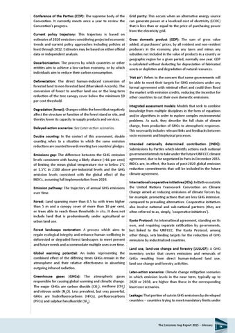 Conference of the Parties (COP): The supreme body of the Convention. It currently meets once a year to review the Convention’s progress. Current policy trajectory: This trajectory is based on estimates of 2020 emissions considering projected economic trends and current policy approaches including policies at least through 2012. Estimates may be based on either official data or independent analysis. Decarbonization: The process by which countries or other entities aim to achieve a low-carbon economy, or by which individuals aim to reduce their carbon consumption. Deforestation: The direct human-induced conversion of forested land to non-forested land (Marrakesh Accords). The conversion of forest to another land use or the long-term reduction of the tree canopy cover below the minimum 10 per cent threshold. Degradation (forest): Changes within the forest that negatively affect the structure or function of the forest stand or site, and thereby lower its capacity to supply products and services. Delayed-action scenarios: See Later-action scenarios. Double counting: In the context of this assessment, double counting refers to a situation in which the same emission reductions are counted towards meeting two countries’ pledges. Emissions gap: The difference between the GHG emission levels consistent with having a likely chance (>66 per cent) of limiting the mean global temperature rise to below 2°C or 1.5°C in 2100 above pre-industrial levels and the GHG emission levels consistent with the global effect of the INDCs, assuming full implementation from 2020. Emission pathway: The trajectory of annual GHG emissions over time. Forest: Land spanning more than 0.5 ha with trees higher than 5 m and a canopy cover of more than 10 per cent, or trees able to reach these thresholds in situ. It does not include land that is predominantly under agricultural or urban land use. Forest landscape restoration: A process which aims to regain ecological integrity and enhance human wellbeing in deforested or degraded forest landscapes to meet present and future needs and accommodate multiple uses over time. Global warming potential: An index representing the combined effect of the differing times GHGs remain in the atmosphere and their relative effectiveness in absorbing outgoing infrared radiation. Greenhouse gases (GHGs): The atmospheric gases responsible for causing global warming and climatic change. The major GHGs are carbon dioxide (CO2), methane (CH4) and nitrous oxide (N2O). Less prevalent, but very powerful, GHGs are hydrofluorocarbons (HFCs), perfluorocarbons (PFCs) and sulphur hexafluoride (SF6).