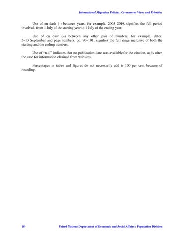 Use of en dash (–) between years, for example, 2005–2010, signifies the full period involved, from 1 July of the starting year to 1 July of the ending year. Use of en dash (–) between any other pair of numbers, for example, dates: 5–13 September and page numbers: pp. 90–101, signifies the full range inclusive of both the starting and the ending numbers. Use of “n.d.” indicates that no publication date was available for the citation, as is often the case for information obtained from websites. Percentages in tables and figures do not necessarily add to 100 per cent because of rounding.