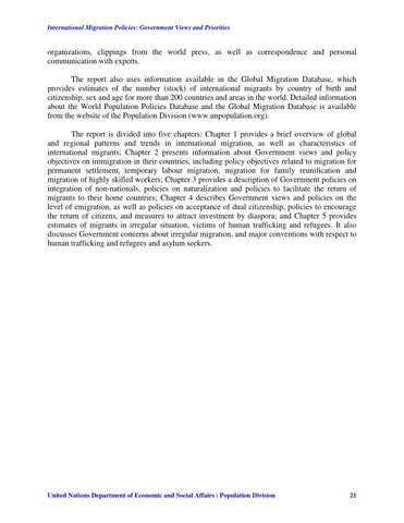 organizations, clippings from the world press, as well as correspondence and personal communication with experts. The report also uses information available in the Global Migration Database, which provides estimates of the number (stock) of international migrants by country of birth and citizenship, sex and age for more than 200 countries and areas in the world. Detailed information about the World Population Policies Database and the Global Migration Database is available from the website of the Population Division (www.unpopulation.org). The report is divided into five chapters: Chapter 1 provides a brief overview of global and regional patterns and trends in international migration, as well as characteristics of international migrants; Chapter 2 presents information about Government views and policy objectives on immigration in their countries, including policy objectives related to migration for permanent settlement, temporary labour migration, migration for family reunification and migration of highly skilled workers; Chapter 3 provides a description of Government policies on integration of non-nationals, policies on naturalization and policies to facilitate the return of migrants to their home countries; Chapter 4 describes Government views and policies on the level of emigration, as well as policies on acceptance of dual citizenship, policies to encourage the return of citizens, and measures to attract investment by diaspora; and Chapter 5 provides estimates of migrants in irregular situation, victims of human trafficking and refugees. It also discusses Government concerns about irregular migration, and major conventions with respect to human trafficking and refugees and asylum seekers.