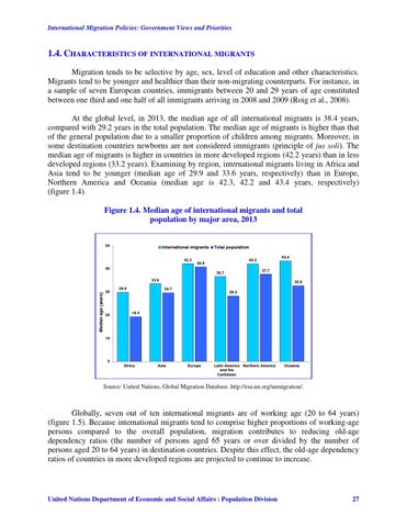 1.4. CHARACTERISTICS OF INTERNATIONAL MIGRANTS Migration tends to be selective by age, sex, level of education and other characteristics. Migrants tend to be younger and healthier than their non-migrating counterparts. For instance, in a sample of seven European countries, immigrants between 20 and 29 years of age constituted between one third and one half of all immigrants arriving in 2008 and 2009 (Roig et al., 2008). At the global level, in 2013, the median age of all international migrants is 38.4 years, compared with 29.2 years in the total population. The median age of migrants is higher than that of the general population due to a smaller proportion of children among migrants. Moreover, in some destination countries newborns are not considered immigrants (principle of jus soli). The median age of migrants is higher in countries in more developed regions (42.2 years) than in less developed regions (33.2 years). Examining by region, international migrants living in Africa and Asia tend to be younger (median age of 29.9 and 33.6 years, respectively) than in Europe, Northern America and Oceania (median age is 42.3, 42.2 and 43.4 years, respectively) (figure 1.4). Figure 1.4. Median age of international migrants and total population by major area, 2013