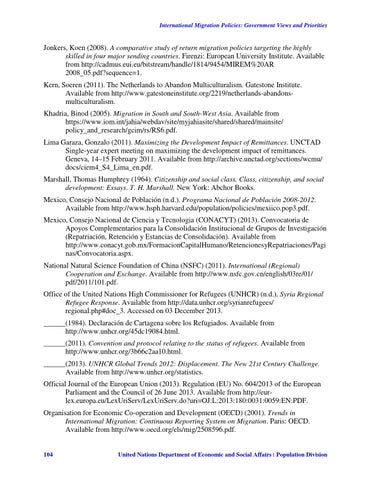 Jonkers, Koen (2008). A comparative study of return migration policies targeting the highly skilled in four major sending countries. Firenzi: European University Institute. Available from http://cadmus.eui.eu/bitstream/handle/1814/9454/MIREM%20AR 2008_05.pdf?sequence=1. Kern, Soeren (2011). The Netherlands to Abandon Multiculturalism. Gatestone Institute. Available from http://www.gatestoneinstitute.org/2219/netherlands-abandonsmulticulturalism. Khadria, Binod (2005). Migration in South and South-West Asia. Available from https://www.iom.int/jahia/webdav/site/myjahiasite/shared/shared/mainsite/ policy_and_research/gcim/rs/RS6.pdf. Lima Garaza, Gonzalo (2011). Maximizing the Development Impact of Remittances. UNCTAD Single-year expert meeting on maximizing the development impact of remittances. Geneva, 14–15 February 2011. Available from http://archive.unctad.org/sections/wcmu/ docs/ciem4_S4_Lima_en.pdf. Marshall, Thomas Humphrey (1964). Citizenship and social class. Class, citizenship, and social development: Essays. T. H. Marshall. New York: Abchor Books. Mexico, Consejo Nacional de Población (n.d.). Programa Nacional de Población 2008-2012. Available from http://www.hsph.harvard.edu/population/policies/mexiico.pop3.pdf. Mexico, Consejo Nacional de Ciencia y Tecnologia (CONACYT) (2013). Convocatoria de Apoyos Complementarios para la Consolidación Institucional de Grupos de Investigación (Repatriación, Retención y Estancias de Consolidación). Available from http://www.conacyt.gob.mx/FormacionCapitalHumano/RetencionesyRepatriaciones/Pagi nas/Convocatoria.aspx. National Natural Science Foundation of China (NSFC) (2011). International (Regional) Cooperation and Exchange. Available from http://www.nsfc.gov.cn/english/03re/01/ pdf/2011/101.pdf. Office of the United Nations High Commissioner for Refugees (UNHCR) (n.d.). Syria Regional Refugee Response. Available from http://data.unhcr.org/syrianrefugees/ regional.php#doc_3. Accessed on 03 December 2013. ______(1984). Declaración de Cartagena sobre los Refugiados. Available from http://www.unhcr.org/45dc19084.html. ______(2011). Convention and protocol relating to the status of refugees. Available from http://www.unhcr.org/3b66c2aa10.html. ______(2013). UNHCR Global Trends 2012: Displacement. The New 21st Century Challenge. Available from http://www.unhcr.org/statistics. Official Journal of the European Union (2013). Regulation (EU) No. 604/2013 of the European Parliament and the Council of 26 June 2013. Available from http://eurlex.europa.eu/LexUriServ/LexUriServ.do?uri=OJ:L:2013:180:0031:0059:EN:PDF. Organisation for Economic Co-operation and Development (OECD) (2001). Trends in International Migration: Continuous Reporting System on Migration. Paris: OECD. Available from http://www.oecd.org/els/mig/2508596.pdf.