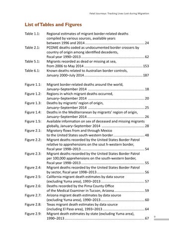 Regional estimates of migrant border-related deaths compiled by various sources, available years between 1996 and 2014.............................................................. 24 PCOME deaths coded as undocumented border crossers by country of origin among identified decedents, fiscal year 1990–2013.................................................................. 62 Migrants recorded as dead or missing at sea, from 2006 to May 2014............................................................. 153 Known deaths related to Australian border controls, January 2000–July 2014............................................................. 187 Migrant border-related deaths around the world, January–September 2014 ........................................................... 18 Regions in which migrant deaths occurred, January–September 2014 ........................................................... 20 Deaths by migrants’ region of origin, January–September 2014 ........................................................... 25 Deaths in the Mediterranean by migrants’ region of origin, January–September 2014............................................................ 26 Available information on sex of deceased and missing migrants globally, January–September 2014 ............................................. 28 Migratory flows from and through Mexico to the United States south-western border................................. 48 Migrant deaths recorded by the United States Border Patrol relative to apprehensions on the sout h-western border, fiscal year 1998–2013.................................................................. 54 Migrant deaths recorded by the United States Border Patrol per 100,000 apprehensions on the south-western border, fiscal year 1998–2013.................................................................. 55 Migrant deaths recorded by the United States Border Patrol by sector, fiscal year 1998–2013.................................................. 56 California migrant death estimates by data source (excluding Yuma area), 1993–2013.............................................. 57 Deaths recorded by the Pima County Office of the Medical Examiner in Tucson, Arizona................................ 59 Arizona migrant death estimates by data source (excluding Yuma area), 1990–2013.............................................. 60 Texas migrant death estimates by data source (including El Paso area), 1993–2013............................................ 64 Migrant death estimates by state (excluding Yuma area), 1990–2013................................................................................... 67