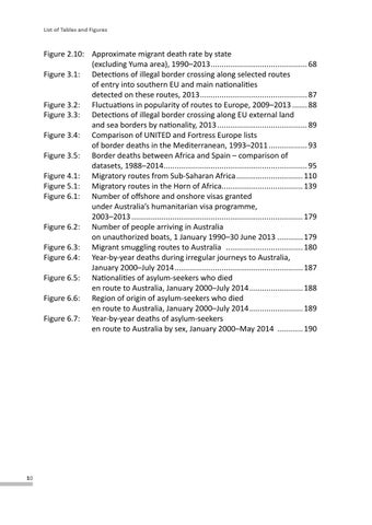 Figure 2.10: Approximate migrant death rate by state (excluding Yuma area), 1990–2013.............................................. 68 Figure 3.1: Detections of illegal border crossing along selected routes of entry into southern EU and main nationalities detected on these routes, 2013................................................... 87 Figure 3.2: Fluctuations in popularity of routes to Europe, 2009–2013........ 88 Figure 3.3: Detections of illegal border crossing along EU external land and sea borders by nationality, 2013........................................... 89 Figure 3.4: Comparison of UNITED and Fortress Europe lists of border deaths in the Mediterranean, 1993–2011................... 93 Figure 3.5: Border deaths between Africa and Spain – comparison of datasets, 1988–2014.................................................................... 95 Figure 4.1: Migratory routes from Sub-Saharan Africa................................ 110 Figure 5.1: Migratory routes in the Horn of Africa...................................... 139 Figure 6.1: Number of offshore and onshore visas granted under Australia’s humanitarian visa programme, 2003–2013................................................................................. 179 Figure 6.2: Number of people arriving in Australia on unauthorized boats, 1 January 1990–30 June 2013............. 179 Figure 6.3: Migrant smuggling routes to Australia ..................................... 180 Figure 6.4: Year-by-year deaths during irregular journeys to Australia, January 2000–July 2014............................................................. 187 Figure 6.5: Nationalities of asylum-seekers who died en route to Australia, January 2000–July 2014.......................... 188 Figure 6.6: Region of origin of asylum-seekers who died en route to Australia, January 2000–July 2014.......................... 189 Figure 6.7: Year-by-year deaths of asylum-seekers en route to Australia by sex, January 2000–May 2014 ............. 190