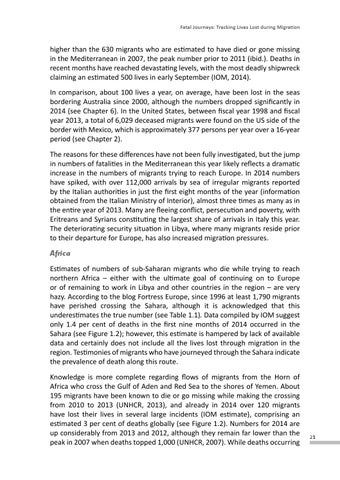 higher than the 630 migrants who are estimated to have died or gone missing in the Mediterranean in 2007, the peak number prior to 2011 (ibid.). Deaths in recent months have reached devastating levels, with the most deadly shipwreck claiming an estimated 500 lives in early September (IOM, 2014). In comparison, about 100 lives a year, on average, have been lost in the seas bordering Australia since 2000, although the numbers dropped significantly in 2014 (see Chapter 6). In the United States, between fiscal year 1998 and fiscal year 2013, a total of 6,029 deceased migrants were found on the US side of the border with Mexico, which is approximately 377 persons per year over a 16-year period (see Chapter 2). The reasons for these differences have not been fully investigated, but the jump in numbers of fatalities in the Mediterranean this year likely reflects a dramatic increase in the numbers of migrants trying to reach Europe. In 2014 numbers have spiked, with over 112,000 arrivals by sea of irregular migrants reported by the Italian authorities in just the first eight months of the year (information obtained from the Italian Ministry of Interior), almost three times as many as in the entire year of 2013. Many are fleeing conflict, persecution and poverty, with Eritreans and Syrians constituting the largest share of arrivals in Italy this year. The deteriorating security situation in Libya, where many migrants reside prior to their departure for Europe, has also increased migration pressures. Africa Estimates of numbers of sub-Saharan migrants who die while trying to reach northern Africa – either with the ultimate goal of continuing on to Europe or of remaining to work in Libya and other countries in the region – are very hazy. According to the blog Fortress Europe, since 1996 at least 1,790 migrants have perished crossing the Sahara, although it is acknowledged that this underestimates the true number (see Table 1.1). Data compiled by IOM suggest only 1.4 per cent of deaths in the first nine months of 2014 occurred in the Sahara (see Figure 1.2); however, this estimate is hampered by lack of available data and certainly does not include all the lives lost through migration in the region. Testimonies of migrants who have journeyed through the Sahara indicate the prevalence of death along this route. Knowledge is more complete regarding flows of migrants from the Horn of Africa who cross the Gulf of Aden and Red Sea to the shores of Yemen. About 195 migrants have been known to die or go missing while making the crossing from 2010 to 2013 (UNHCR, 2013), and already in 2014 over 120 migrants have lost their lives in several large incidents (IOM estimate), comprising an estimated 3 per cent of deaths globally (see Figure 1.2). Numbers for 2014 are up considerably from 2013 and 2012, although they remain far lower than the peak in 2007 when deaths topped 1,000 (UNHCR, 2007). While deaths occurring