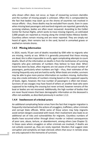 who drown often does not occur, as hope of recovering survivors dwindles and the number of missing people is unknown. Often this is compounded by the fact that bodies may wash up on the shores of countries not involved in rescue efforts - thus, these deaths may be excluded from counts. Even in cases when missing boat passengers and overland migrants are reported, generally by surviving relatives, bodies are often never recovered. According to the Colibrà Center for Human Rights, which works to trace missing migrants, an estimated 2,000 people are reported as missing along the United States–Mexico border. Countless others remain missing and are never reported. They are simply not heard of again, their remains lost in the sand, buried in unmarked graves or washed on remote shores. 1.4.3 Missing information In 2014, nearly 70 per cent of deaths recorded by IOM refer to migrants who are missing, mainly at sea. While it is generally presumed that those missing are dead, this is often impossible to verify, again complicating attempts to count deaths. Much of the information on deaths is from the testimonies of surviving migrants who give estimates of numbers they believe to have died. When travel has been by boat, often migrants are not aware of the actual number of passengers, particularly when numbers are high – thus, their estimates of the missing frequently vary and are hard to verify. When boats are smaller, survivors may be able to give more precise information on numbers missing. Authorities may also create estimates of numbers missing based on the supposed capacity of boats. Again, however, the true number of passengers is often not known. Survivors of sea voyages may have heard of others on another boat who were supposed to be making the crossing but never arrived, however remains of the boat or bodies are not recovered. Additionally, the high number of bodies that are never found means that basic demographic information on the deceased is often not available, as described previously in section 1.3.2. 1.4.4 Involvement of criminal actors
