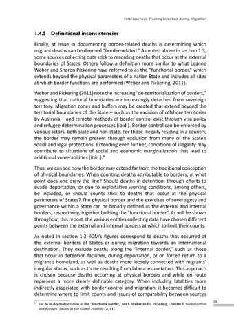1.4.5 Definitional inconsistencies Finally, at issue in documenting border-related deaths is determining which migrant deaths can be deemed “border-related.” As noted above in section 1.3, some sources collecting data stick to recording deaths that occur at the external boundaries of States. Others follow a definition more similar to what Leanne Weber and Sharon Pickering have referred to as the “functional border,” which extends beyond the physical parameters of a nation State and includes all sites at which border functions are performed (Weber and Pickering, 2011). Weber and Pickering (2011) note the increasing “de-territorialization of borders,” suggesting that national boundaries are increasingly detached from sovereign territory. Migration zones and buffers may be created that extend beyond the territorial boundaries of the State – such as the excision of offshore territories by Australia – and remote methods of border control exist through visa policy and refugee determination processes (ibid.). Border control can be enforced by various actors, both state and non-state. For those illegally residing in a country, the border may remain present through exclusion from many of the State’s social and legal protections. Extending even further, conditions of illegality may contribute to situations of social and economic marginalization that lead to additional vulnerabilities (ibid.).9 Thus, we can see how the border may extend far from the traditional conception of physical boundaries. When counting deaths attributable to borders, at what point does one draw the line? Should deaths in detention, through efforts to evade deportation, or due to exploitative working conditions, among others, be included, or should counts stick to deaths that occur at the physical perimeters of States? The physical border and the exercises of sovereignty and governance within a State can be broadly defined as the external and internal borders, respectively, together building the “functional border.” As will be shown throughout this report, the various entities collecting data have chosen different points between the external and internal borders at which to limit their counts. As noted in section 1.3, IOM’s figures correspond to deaths that occurred at the external borders of States or during migration towards an international destination. They exclude deaths along the “internal border,” such as those that occur in detention facilities, during deportation, or on forced return to a migrant’s homeland, as well as deaths more loosely connected with migrants’ irregular status, such as those resulting from labour exploitation. This approach is chosen because deaths occurring at physical borders and while en route represent a more clearly definable category. When including fatalities more indirectly associated with border control and migration, it becomes difficult to determine where to limit counts and issues of comparability between sources 9