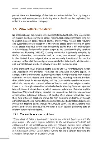 1.5 Who collects the data? No organization at the global level is currently tasked with collecting information on migrant deaths occurring in border regions. National governments tend not to publish data on border-related deaths, and very few release data regularly and systematically (an exception is the United States Border Patrol). In some cases, States may have information concerning deaths that is not made public as it is collected for law enforcement purposes and considered highly sensitive (Weber and Pickering, 2011:42). Existing information is generally compiled by NGOs, universities, humanitarian and, at times, international organizations. In the United States, migrant deaths are normally investigated by medical examiners offices (at the county- or more rarely the state-level). Media outlets and journalists have also been actively involved in tracking deaths. Some prominent NGOs tracking deaths include UNITED for Intercultural Action and Asociación Pro Derechos Humanos de Andalucía (APDHA) (Spain) in Europe; in the United States several organizations have partnered with medical examiners to track deaths and identify remains, including Humane Borders, the Colibrí Center for Human Rights, and the Coalición de Derechos Humanos, which also works with consular offices of Mexico and other origin countries. Projects run through universities include the Border Crossing Observatory out of Monash University in Melbourne, which maintains a database of deaths; and the Binational Migration Institute, based at the University of Arizona. International organizations publishing estimates of deaths often obtain knowledge from their field offices in locations known for high numbers of deaths, or through partnerships with local humanitarian organizations. Media outlets and journalists involved in tracking deaths include the Arizona Daily Star, The Migrants Files project and Fortress Europe. See Annex for a list of sources publishing data on migrant border-related deaths. 1.5.1 The media as a source of data “These days, it takes a blockbuster tragedy for migrant boats to reach the front pages – the quiet, regular additions to the Mediterranean’s death toll encountered on an almost-weekly basis by rescuers, human rights activists and migrant communities themselves are simply far too humdrum to make the mainstream news.” (Jack Shenker writing for the Guardian following the Lampedusa shipwreck on 3 October 2013) 32