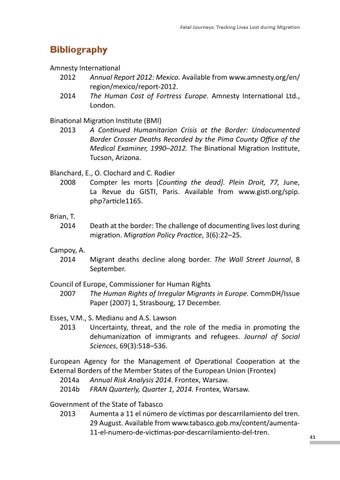 Bibliography Amnesty International Annual Report 2012: Mexico. Available from www.amnesty.org/en/ 2012 region/mexico/report-2012. The Human Cost of Fortress Europe. Amnesty International Ltd., 2014 London. Binational Migration Institute (BMI) 2013 A Continued Humanitarian Crisis at the Border: Undocumented Border Crosser Deaths Recorded by the Pima County Office of the Medical Examiner, 1990–2012. The Binational Migration Institute, Tucson, Arizona. Blanchard, E., O. Clochard and C. Rodier Compter les morts [Counting the dead]. Plein Droit, 77, June, 2008 La Revue du GISTI, Paris. Available from www.gisti.org/spip. php?article1165. Brian, T. 2014