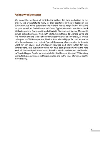Acknowledgements We would like to thank all contributing authors for their dedication to this project, and are grateful to many for their assistance in the production of this publication. We would particularly like to thank Marzia Rango for her invaluable support, as well as Denis Kierans and Emma Eggink. We would also like to thank IOM colleagues in Rome, particularly Flavio Di Giacomo and Simona Moscarelli, as well as Martine Cassar from IOM Malta. Much thanks to Leonard Doyle and Joel Millman and the Media and Communications Division in Geneva, as well as colleagues in IOM Headquarters, Mexico, Australia and Egypt for their assistance with the revision of the content. Special thanks are also extended to Stefanie Grant for her advice, and Christopher Horwood and Marg Hutton for their contributions. This publication would not have been possible without the hard work of the IOM Publications team, based in Manila and Geneva and headed by Valerie Hagger. Finally, we are grateful to IOM Director General, William Lacy Swing, for his commitment to this publication and to the issue of migrant deaths more broadly.