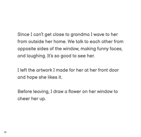 Since I can’t get close to grandma I wave to her from outside her home. We talk to each other from opposite sides of the window, making funny faces, and laughing. It’s so good to see her. I left the artwork I made for her at her front door and hope she likes it. Before leaving, I draw a flower on her window to cheer her up.