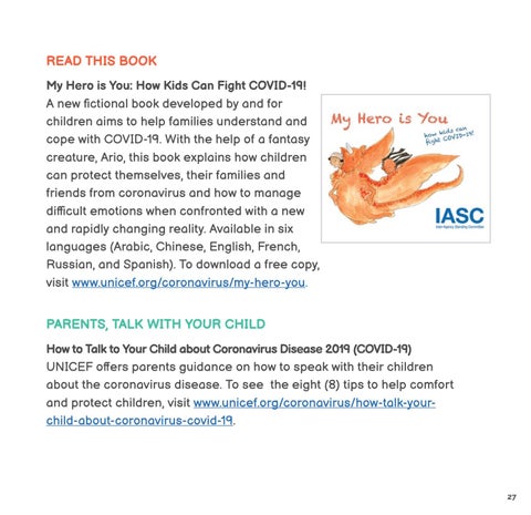 READ THIS BOOK My Hero is You: How Kids Can Fight COVID-19! A new fictional book developed by and for children aims to help families understand and cope with COVID-19. With the help of a fantasy creature, Ario, this book explains how children can protect themselves, their families and friends from coronavirus and how to manage difficult emotions when confronted with a new and rapidly changing reality. Available in six languages (Arabic, Chinese, English, French, Russian, and Spanish). To download a free copy, visit www.unicef.org/coronavirus/my-hero-you.