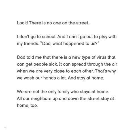 Look! There is no one on the street. I don’t go to school. And I can’t go out to play with my friends. “Dad, what happened to us?” Dad told me that there is a new type of virus that can get people sick. It can spread through the air when we are very close to each other. That’s why we wash our hands a lot. And stay at home. We are not the only family who stays at home. All our neighbors up and down the street stay at home, too.
