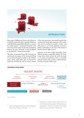 of fear and uncertainty. Intentional homicide also victimizes the family and community of the victim, who can be considered secondary victims,2 and when justice is not served, impunity can lead to further victimization in the form of the denial of the basic human right to justice. Moreover, as the most readily measurable, clearly defined and most comparable indicator for measuring violent deaths around the world, homicide is, in certain circumstances, both a reasonable proxy for violent crime as well as a robust indicator of levels of security within States.