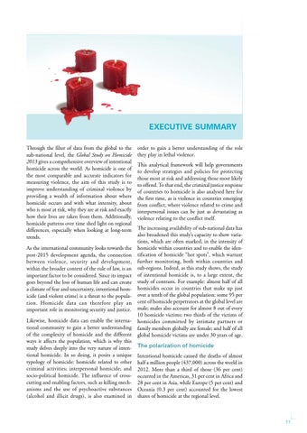 EXECUTIVE SUMMARY Through the filter of data from the global to the sub-national level, the Global Study on Homicide 2013 gives a comprehensive overview of intentional homicide across the world. As homicide is one of the most comparable and accurate indicators for measuring violence, the aim of this study is to improve understanding of criminal violence by providing a wealth of information about where homicide occurs and with what intensity, about who is most at risk, why they are at risk and exactly how their lives are taken from them. Additionally, homicide patterns over time shed light on regional differences, especially when looking at long-term trends. As the international community looks towards the post-2015 development agenda, the connection between violence, security and development, within the broader context of the rule of law, is an important factor to be considered. Since its impact goes beyond the loss of human life and can create a climate of fear and uncertainty, intentional homicide (and violent crime) is a threat to the population. Homicide data can therefore play an important role in monitoring security and justice. Likewise, homicide data can enable the international community to gain a better understanding of the complexity of homicide and the different ways it affects the population, which is why this study delves deeply into the very nature of intentional homicide. In so doing, it posits a unique typology of homicide: homicide related to other criminal activities; interpersonal homicide; and socio-political homicide. The influence of crosscutting and enabling factors, such as killing mechanisms and the use of psychoactive substances (alcohol and illicit drugs), is also examined in