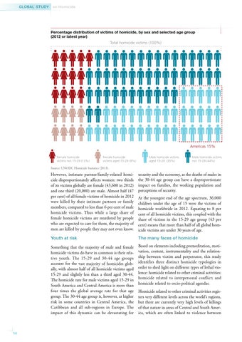 At the youngest end of the age spectrum, 36,000 children under the age of 15 were the victims of homicide worldwide in 2012. Equating to 8 per cent of all homicide victims, this coupled with the share of victims in the 15-29 age group (43 per cent) means that more than half of all global homicide victims are under 30 years of age.