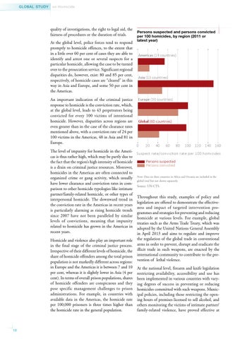quality of investigations, the right to legal aid, the fairness of procedures or the duration of trials. At the global level, police forces tend to respond promptly to homicide offences, to the extent that in a little over 60 per cent of cases they are able to identify and arrest one or several suspects for a particular homicide, allowing the case to be turned over to the prosecution service. Significant regional disparities do, however, exist: 80 and 85 per cent, respectively, of homicide cases are “cleared� in this way in Asia and Europe, and some 50 per cent in the Americas. An important indication of the criminal justice response to homicide is the conviction rate, which, at the global level, leads to 43 perpetrators being convicted for every 100 victims of intentional homicide. However, disparities across regions are even greater than in the case of the clearance rates mentioned above, with a conviction rate of 24 per 100 victims in the Americas, 48 in Asia and 81 in Europe.