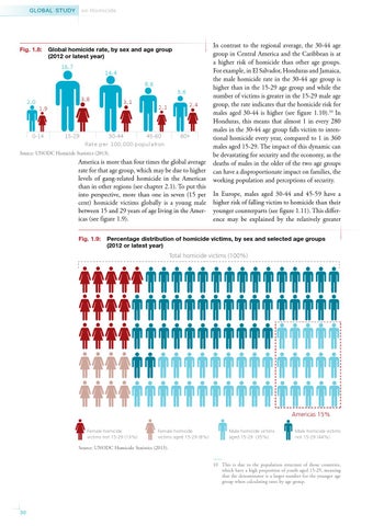 America is more than four times the global average rate for that age group, which may be due to higher levels of gang-related homicide in the Americas than in other regions (see chapter 2.1). To put this into perspective, more than one in seven (15 per cent) homicide victims globally is a young male between 15 and 29 years of age living in the Americas (see figure 1.9).