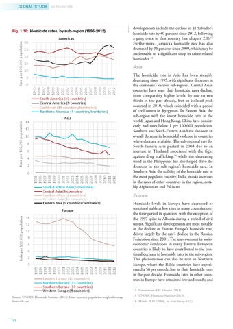 Europe Homicide levels in Europe have decreased or remained stable at low rates in many countries over the time period in question, with the exception of the 1997 spike in Albania during a period of civil unrest. Significant developments are most notable in the decline in Eastern Europe’s homicide rate, driven largely by the rate’s decline in the Russian Federation since 2001. The improvement in socioeconomic conditions in many Eastern European countries is likely to have contributed to the continual decrease in homicide rates in the sub-region. This phenomenon can also be seen in Northern Europe, where the Baltic countries have experienced a 50 per cent decline in their homicide rates in the past decade. Homicide rates in other countries in Europe have remained low and steady, and 12 Government of El Salvador (2013). 13 UNODC Homicide Statistics (2013). 14 Mutebi, A.M. (2004), in Asian Survey 44(1).
