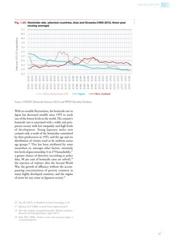 16 Dai, M. (2013), in Handbook of Asian Criminology. P. 18. 17 Johnson, D.T. (2006), in Social Science Japan Journal 9. 18 This data includes attempted homicides. Ministry of Justice, Research and Training Institute, Japan (2011). 19 Park, W.K. (2006). Trends in crime rates in postwar Japan: a structural perspective.