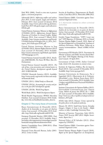 United Nations Assistance Mission in Afghanistan (UNAMA) (2013). Afghanistan Annual Report: Protection of Civilians in Armed Conflict. Kabul, February 2014. (Last accessed 5 March 2014) Available: http://unama.unmissions.org/Portals/ UNAMA/human%20rights/Feb_8_2014_PoCreport_2013-Full-report-ENG.pdf. United Nations Assistance Mission in Iraq (UNAMI) (2013). Human Rights Division (2013) (Last accessed 25 November 2013) Available: http://unami.unmissions.org/Default.aspx?tabid= 5397&language=en-US. United Nations General Assembly (2012). Resolution A/RES/66/288, The Future We Want. (Rio 20+ Declaration). United Nations General Assembly (2013). The rule of law, crime prevention and criminal justice in the United Nations development agenda beyond 2015. E/RES/68/188. UNODC Homicide Statistics (2013). Available: http://www.unodc.org/unodc/en/data-and-analysis/homicide.html. UNODC (2011). Global Study on Homicide. UNODC (2013a). Accounting for security and justice in the post-2015 development agenda. UNODC (2013b). World Drug Report. World Bank (2011). World Development Report. World Health Organization (WHO) Mortality Database. (Last accessed 22 January 2014) Available: www.who.int/healthinfo/mortality_data/en.