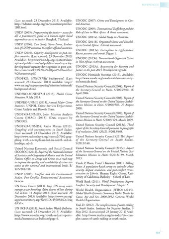 UNODC (2007). Crime and Development in Central America. UNODC (2009). Transnational Trafficking and the Rule of Law in West Africa: A threat assessment. UNODC (2011a). Global Study on Homicide. UNODC (2011b). Organized Crime and Instability in Central Africa: A threat assessment. UNODC (2013a). Corruption in Afghanistan: Recent patterns and trends. Figure 1. UNODC (2013b). Transnational Organized Crime in West Africa: A threat assessment. UNODC (2013c). Accounting for Security and Justice in the post-2015 Development Agenda. UNODC Homicide Statistics (2013). Available: http://www.unodc.org/unodc/en/data-and-analysis/homicide.html. United Nations Security Council (2004). Report of the Secretary-General on Haiti. S/2004/300. 16 April 2004. United Nations Security Council (2008). Report of the Secretary-General on the United Nations Stabilization Mission in Haiti. S/2008/586. 27 August 2008. United Nations Security Council (2009). Report of the Secretary-General on the United Nations Stabilization Mission in Haiti. S/2009/129. March 2009. United Nations Security Council (2013a). Third report of the Secretary-General pursuant to paragraph 6 of resolution 2061 (2012). S/2013/408. United Nations Security Council (2013b). Report of the Secretary-General on South Sudan. S/2013/140. United Nations Security Council (2013c). Report of the Secretary-General on the United Nations Stabilization Mission in Haiti. S/2013/139. March 2013. Vinck, P, Pham, P. and T. Kreutzer (2011). Talking Peace: A population-based survey on attitudes about security, dispute resolution, and post-conflict reconstruction in Liberia. Human Rights Center, University of California, Berkeley – School of Law. World Bank (2011). World Development Report: Conflict, Security and Development: Chapter 1. World Health Organization (WHO) (2014). Global Health Estimates Summary Tables: Deaths by Cause, Age and Sex, 2000-2012. Geneva: World Health Organization. Yual, D. (2012). The complex causes of cattle raiding in South Sudan. Institute for Security Studies. 9 May 2012. (Last accessed: 23 January 2014) Available: http://www.issafrica.org/iss-today/the-complex-causes-of-cattle-raiding-in-south-sudan.