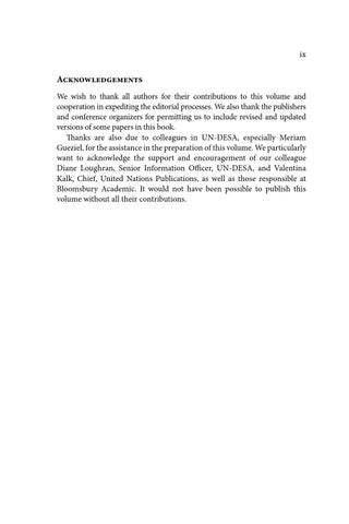 Acknowledgements We wish to thank all authors for their contributions to this volume and cooperation in expediting the editorial processes. We also thank the publishers and conference organizers for permitting us to include revised and updated versions of some papers in this book. Thanks are also due to colleagues in UN-DESA, especially Meriam Gueziel, for the assistance in the preparation of this volume. We particularly want to acknowledge the support and encouragement of our colleague Diane Loughran, Senior Information Officer, UN-DESA, and Valentina Kalk, Chief, United Nations Publications, as well as those responsible at Bloomsbury Academic. It would not have been possible to publish this volume without all their contributions.