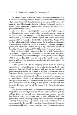 2 • Is Good Governance Good for Development? The notion of ‘good governance’ met this new expectation in two ways. Conceived as authority potentially beyond politics and the traditional scope of government administration, it claims autonomy for ostensibly technocratic authority from Olsonian distributional coalitions. Individuals can thus be drawn directly into market processes while bypassing competitive politics presumed to be rent-seeking. After over a decade of growing influence, more recently, however, new thinking about governance seems to have become increasingly influential in policy circles, for example, in the Department for International Development (DFID) in the United Kingdom and French Development Agency (AFD) in France (see DFID 2003; Meisel and Ould-Aoudia 2007). In the evolution of the idea of governance, the first phase emphasized a narrow view of governance – such as technocratic measures to improve government effectiveness and to develop a legal framework for marketbased development – in the early World Bank reports on governance. Hout and Robison (2009) suggest that then World Bank President James Wolfensohn’s Comprehensive Development Framework (CDF), the Poverty Reduction Strategy approach and the post-Washington Consensus (Stiglitz 1998; Jomo and Fine 2005) were all part of the second phase’s broader concern with political organization, emphasizing civic participation and social inclusion. A third phase seems to be emerging, characterized by increasing sensitivity of power, politics and social conflict in shaping development outcomes; these are difficult to address with existing institutional and governance programmes. For example, as Mungiu-Pippidi (2006) pointed out, the main result of many anti-corruption policies introduced in Romania with the assistance of the international ‘good governance’ programmes was the establishment of many new institutions (anti-corruption ombudsmen and special prosecutors, etc.). But the problem is that these new institutions were quickly taken over by existing corrupt political networks and other interests. The same was true of the former Soviet Republics, including Russia. More recently, there has been a growing debate and willingness to consider the political economy of governance. It is now widely acknowledged that political factors are not only more important than previously thought, but also that neither politics nor power is easily addressed with ‘good governance’ reforms or by engineering institutional change. Such political economy understandings of governance may well rescue the relevance of governance to development. However, efforts to depoliticize development in favour of ostensibly technocratic solutions continue. The continuing tension