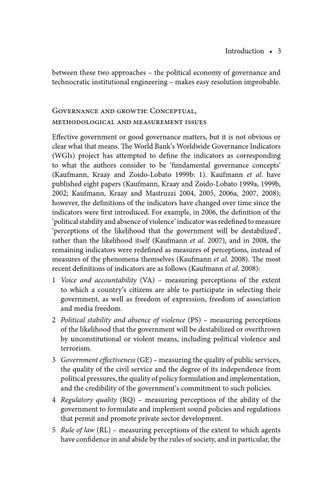 Governance and growth: Conceptual, methodological and measurement issues Effective government or good governance matters, but it is not obvious or clear what that means. The World Bank’s Worldwide Governance Indicators (WGIs) project has attempted to define the indicators as corresponding to what the authors consider to be ‘fundamental governance concepts’ (Kaufmann, Kraay and Zoido-Lobato 1999b: 1). Kaufmann et al. have published eight papers (Kaufmann, Kraay and Zoido-Lobato 1999a, 1999b, 2002; Kaufmann, Kraay and Mastruzzi 2004, 2005, 2006a, 2007, 2008); however, the definitions of the indicators have changed over time since the indicators were first introduced. For example, in 2006, the definition of the ‘political stability and absence of violence’ indicator was redefined to measure ‘perceptions of the likelihood that the government will be destabilized’, rather than the likelihood itself (Kaufmann et al. 2007), and in 2008, the remaining indicators were redefined as measures of perceptions, instead of measures of the phenomena themselves (Kaufmann et al. 2008). The most recent definitions of indicators are as follows (Kaufmann et al. 2008): 1 Voice and accountability (VA) – measuring perceptions of the extent to which a country’s citizens are able to participate in selecting their government, as well as freedom of expression, freedom of association and media freedom. 2 Political stability and absence of violence (PS) – measuring perceptions of the likelihood that the government will be destabilized or overthrown by unconstitutional or violent means, including political violence and terrorism. 3 Government effectiveness (GE) – measuring the quality of public services, the quality of the civil service and the degree of its independence from political pressures, the quality of policy formulation and implementation, and the credibility of the government’s commitment to such policies. 4 Regulatory quality (RQ) – measuring perceptions of the ability of the government to formulate and implement sound policies and regulations that permit and promote private sector development. 5 Rule of law (RL) – measuring perceptions of the extent to which agents have confidence in and abide by the rules of society, and in particular, the