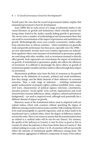 8 • Is Good Governance Good for Development? Teorell reject the view that the record of government failures implies that minimalist government is best for development. Aron (2000) did an early survey of a range of influential studies in the varied literature on growth and institutions, which critically assesses the strong claims found in the studies causally linking growth to governance. The survey notes a number of methodological and measurement flaws that can result in overestimation of the impact of governance and institutions on growth. Methodologically, most cross-country econometric studies suffer from selection bias, as African countries – where institutions are generally weak and growth performance has been poor, especially since the 1980s – are over represented. Second, most cross-country regressions use reducedform equations where some measures of institutional or governance quality are used along with other variables, such as investment assumed to directly affect growth. Such regressions can overestimate the impact of institutions on growth, if institutional or governance quality also affects the efficiency of investment. It is difficult to disentangle the direct effects on growth of institutional quality variables and their indirect effects through their impact on investment. Measurement problems arise from the lack of consensus in the growth literature on the definition of economic, political and social institutions, how they change, and the likely channels of their influence on economic outcomes. Thus, a wide range of indicators – including institutional quality (enforcement of property rights), political instability (riots, coups, civil wars), characteristics of political regimes (elections, constitutions, executive powers), ‘social capital’ (civic activity, organizations) and social characteristics (income differences, ethnic, religious, cultural and historical background) – are used in empirical work, although each potentially has a different channel of impact on growth. Moreover, many of the institutional indices used in empirical work are ordinal indices which rank countries without specifying the degree of difference among countries and associate a number with a ranking. However, to be used meaningfully in a growth regression, such an index needs to be transformed into a cardinal index, where the degree of difference matters, not just the order. There is no reason to assume that the transformation from an ordinal to a cardinal index will be one-for-one (linear). For instance, the quality of the judiciary in Country A may be twice as good as that in Country B, where the judiciary is three times better than in Country C. But ordinal ranking on a scale, say from 1 to 10, of countries will not necessarily reflect the intensity of institutional quality differences among them. The often arbitrary aggregation of different components of many of the indices