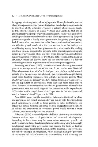 12 • Is Good Governance Good for Development? for appropriate strategies to induce high growth. He emphasizes the absence of any strong econometric evidence that relates standard governance criteria to growth as all the ostensible evidence is actually about income levels. Rodrik cites the example of China, Vietnam and Cambodia that are all growing rapidly despite poor governance indicators. Many other cases show that large-scale institutional transformation of the type entailed by the good governance agenda is hardly ever a prerequisite for getting growth going. Rodrik notes that poor countries suffer from a multitude of constraints, and effective growth acceleration interventions are those that address the most binding among them. Poor governance in general may be the binding constraint in some countries but certainly not in countries growing rapidly despite poor governance. Thus, as a rule, broad good governance reform is neither necessary nor sufficient for growth. It is not necessary, as the examples of China, Vietnam and Ethiopia show, and also not sufficient as it is difficult to sustain governance improvements without accompanying growth. According to Andrews (2010), countries with more effective governments grew at an average annual rate of less than 2 per cent between 2000 and 2006, whereas countries with ‘ineffective’ governments (scoring below zero) actually grew by an average rate of about 4 per cent annually, despite facing much more daunting challenges, such as higher population growth. More effective governments generally also have higher domestic revenue sources, are less dependent on international trade taxes and more dependent on direct domestic income taxes than less effective governments. More effective governments were also much bigger in size in terms of public expenditure/ GDP ratios, which ranged from 37 to 73 per cent in the mid-1990s and stood at between 35 and 55 per cent in 2004. Aron (2000) notes that the correlations between institutional variables and growth are not robust, and causality can run in both directions, from good institutions to growth or from growth to better institutions. She argues that a more plausible and hence credible interpretation of the effects of politics and institutions on economic growth would require a more coherent, consistent and persuasive approach. Fukuyama (2008) acknowledges the likelihood of two-way relationships between various aspects of governance and economic development. According to him, there may be cases where economic growth not underpinned by a strong developmental state but by a state with ‘just enough’ development accelerating governance may become the basis for further political and social development, tantamount to governance improvements. He cites the example of Bangladesh, where although fixing the problems of corruption and lack of democratic accountability is still daunting, the
