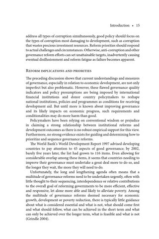 Introduction • 15 address all types of corruption simultaneously, good policy should focus on the types of corruption most damaging to development, such as corruption that wastes precious investment resources. Reform priorities should respond to actual challenges and circumstances. Otherwise, anti-corruption and other governance reform efforts can set unattainable targets, inadvertently causing eventual disillusionment and reform fatigue as failure becomes apparent.