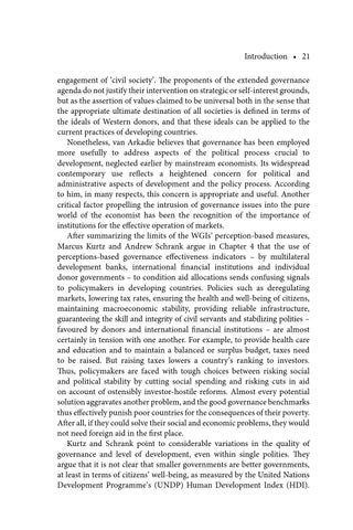 Introduction • 21 engagement of ‘civil society’. The proponents of the extended governance agenda do not justify their intervention on strategic or self-interest grounds, but as the assertion of values claimed to be universal both in the sense that the appropriate ultimate destination of all societies is defined in terms of the ideals of Western donors, and that these ideals can be applied to the current practices of developing countries. Nonetheless, van Arkadie believes that governance has been employed more usefully to address aspects of the political process crucial to development, neglected earlier by mainstream economists. Its widespread contemporary use reflects a heightened concern for political and administrative aspects of development and the policy process. According to him, in many respects, this concern is appropriate and useful. Another critical factor propelling the intrusion of governance issues into the pure world of the economist has been the recognition of the importance of institutions for the effective operation of markets. After summarizing the limits of the WGIs’ perception-based measures, Marcus Kurtz and Andrew Schrank argue in Chapter 4 that the use of perceptions-based governance effectiveness indicators – by multilateral development banks, international financial institutions and individual donor governments – to condition aid allocations sends confusing signals to policymakers in developing countries. Policies such as deregulating markets, lowering tax rates, ensuring the health and well-being of citizens, maintaining macroeconomic stability, providing reliable infrastructure, guaranteeing the skill and integrity of civil servants and stabilizing polities – favoured by donors and international financial institutions – are almost certainly in tension with one another. For example, to provide health care and education and to maintain a balanced or surplus budget, taxes need to be raised. But raising taxes lowers a country’s ranking to investors. Thus, policymakers are faced with tough choices between risking social and political stability by cutting social spending and risking cuts in aid on account of ostensibly investor-hostile reforms. Almost every potential solution aggravates another problem, and the good governance benchmarks thus effectively punish poor countries for the consequences of their poverty. After all, if they could solve their social and economic problems, they would not need foreign aid in the first place. Kurtz and Schrank point to considerable variations in the quality of governance and level of development, even within single polities. They argue that it is not clear that smaller governments are better governments, at least in terms of citizens’ well-being, as measured by the United Nations Development Programme’s (UNDP) Human Development Index (HDI).