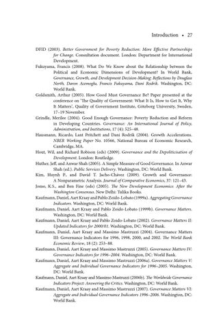 Introduction • 27 DFID (2003). Better Government for Poverty Reduction: More Effective Partnerships for Change. Consultation document. London: Department for International Development. Fukuyama, Francis (2008). What Do We Know about the Relationship between the Political and Economic Dimensions of Development? In World Bank, Governance, Growth, and Development Decision-Making: Reflections by Douglass North, Daron Acemoglu, Francis Fukuyama, Dani Rodrik. Washington, DC: World Bank. Goldsmith, Arthur (2005). How Good Must Governance Be? Paper presented at the conference on ‘The Quality of Government: What It Is, How to Get It, Why It Matters’, Quality of Government Institute, Göteborg University, Sweden, 17–19 November. Grindle, Merilee (2004). Good Enough Governance: Poverty Reduction and Reform in Developing Countries. Governance: An International Journal of Policy, Administration, and Institutions, 17 (4): 525–48. Hausmann, Ricardo, Lant Pritchett and Dani Rodrik (2004). Growth Accelerations. NBER Working Paper No. 10566, National Bureau of Economic Research, Cambridge, MA. Hout, Wil, and Richard Robison (eds) (2009). Governance and the Depoliticisation of Development. London: Routledge. Huther, Jeff, and Anwar Shah (2005). A Simple Measure of Good Governance. In Anwar Shah (ed.). Public Services Delivery. Washington, DC: World Bank. Kim, Huynh P., and David T. Jacho-Chávez (2009). Growth and Governance: A Nonparametric Analysis. Journal of Comparative Economics, 37: 121–43. Jomo, K.S., and Ben Fine (eds) (2005). The New Development Economics: After the Washington Consensus. New Delhi: Tulika Books. Kaufmann, Daniel, Aart Kraay and Pablo Zoido-Lobato (1999a). Aggregating Governance Indicators. Washington, DC: World Bank. Kaufmann, Daniel, Aart Kraay and Pablo Zoido-Lobato (1999b). Governance Matters. Washington, DC: World Bank. Kaufmann, Daniel, Aart Kraay and Pablo Zoido-Lobato (2002). Governance Matters II: Updated Indicators for 2000/01. Washington, DC: World Bank. Kaufmann, Daniel, Aart Kraay and Massimo Mastruzzi (2004). Governance Matters III: Governance Indicators for 1996, 1998, 2000, and 2002. The World Bank Economic Review, 18 (2): 253–88. Kaufmann, Daniel, Aart Kraay and Massimo Mastruzzi (2005). Governance Matters IV: Governance Indicators for 1996–2004. Washington, DC: World Bank. Kaufmann, Daniel, Aart Kraay and Massimo Mastruzzi (2006a). Governance Matters V: Aggregate and Individual Governance Indicators for 1996–2005. Washington, DC: World Bank. Kaufmann, Daniel, Aart Kraay and Massimo Mastruzzi (2006b). The Worldwide Governance Indicators Project: Answering the Critics. Washington, DC: World Bank. Kaufmann, Daniel, Aart Kraay and Massimo Mastruzzi (2007). Governance Matters VI: Aggregate and Individual Governance Indicators 1996–2006. Washington, DC: World Bank.