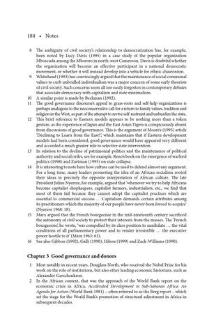 The ambiguity of civil society’s relationship to democratization has, for example, been noted by Lucy Davis (1995) in a case study of the popular organization Mboscuda among the Mbororo in north-west Cameroon. Davis is doubtful whether the organization will become an effective participant in a national democratic movement, or whether it will instead develop into a vehicle for ethnic chauvinism. Whitehead (1993) has convincingly argued that the maintenance of social communal values to curb unbridled individualism was a major concern of some early theorists of civil society. Such concerns seem all too easily forgotten in contemporary debates that associate democracy with capitalism and state minimalism. A similar point is made by Beckman (1992). The good governance discourse’s appeal to grass-roots and self-help organizations is perhaps analogous to the neoconservative call for a return to family values, tradition and religion in the West, as part of the attempt to revive self-restraint and unburden the state. This brief reference to Eastern models appears to be nothing more than a token gesture, as the experience of Japan and the East Asian Tigers is conspicuously absent from discussions of good governance. This is the argument of Moore’s (1993) article ‘Declining to Learn from the East?’, which maintains that if Eastern development models had been considered, good governance would have appeared very different and accorded a much greater role to selective state intervention. In relation to the decline of patrimonial politics and the maintenance of political authority and social order, see for example, Reno’s book on the emergence of warlord politics (1998) and Zartman (1995) on state collapse. It is interesting to note here how culture can be used to defend almost any argument. For a long time, many leaders promoting the idea of an African socialism rooted their ideas in precisely the opposite interpretation of African culture. The late President Julius Nyerere, for example, argued that ‘whenever we try to help Africans become capitalist shopkeepers, capitalist farmers, industrialists, etc., we find that most of them fail because they cannot adopt the capitalist practices which are essential to commercial success … Capitalism demands certain attributes among its practitioners which the majority of our people have never been forced to acquire’ (Nyerere 1968: 18). Marx argued that the French bourgeoisie in the mid-nineteenth century sacrificed the autonomy of civil society to protect their interests from the masses. The ‘French bourgeoisie’, he wrote, ‘was compelled by its class position to annihilate … the vital conditions of all parliamentary power and to render irresistible … the executive power hostile to it’ (Marx 1963: 63). See also Gibbon (1992), Galli (1990), Hibou (1999) and Zack-Williams (1990).