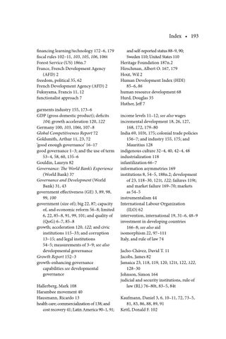 and self-reported status 88–9, 90; Sweden 110; United States 110 Heritage Foundation 187n.2 Hirschman, Albert O. 167, 179 Hout, Wil 2 Human Development Index (HDI) 85–6, 86 human resource development 68 Hurd, Douglas 35 Huther, Jeff 7 income levels 11–12; see also wages incremental development 18, 26, 127, 168, 172, 179–80 India 69, 103t, 175; colonial trade policies 156–7; and industry 155, 175; and Mauritius 128 indigenous culture 32–4, 40, 42–4, 48 industrialization 118 infantilization 66–7 information asymmetries 169 institutions 8, 54–5, 188n.2; development of 23, 118–30, 121t, 122; failures 119t; and market failure 169–70; markets as 54–5 instrumentalism 44 International Labour Organization (ILO) 62 intervention, international 19, 31–6, 48–9 investment in developing countries 166–8; see also aid isomorphism 22, 97–111 Italy, and rule of law 74 Jacho-Chávez, David T. 11 Jacobs, James 82 Jamaica 23, 118, 119, 120, 121t, 122, 122, 128–30 Johnson, Simon 164 judicial and security institutions, rule of law (RL) 76–80t, 83–5, 84t Kaufmann, Daniel 3, 6, 10–11, 72, 73–5, 81, 83, 86, 88, 89, 91 Kettl, Donald F. 102