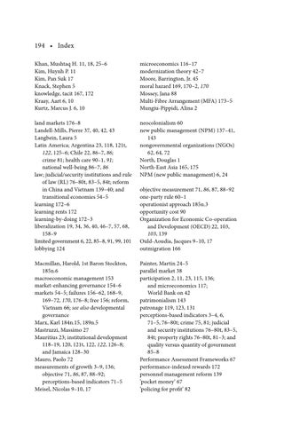 land markets 176–8 Landell-Mills, Pierre 37, 40, 42, 43 Langbein, Laura 5 Latin America; Argentina 23, 118, 121t, 122, 125–6; Chile 22, 86–7, 86; crime 81; health care 90–1, 91; national well-being 86–7, 86 law; judicial/security institutions and rule of law (RL) 76–80t, 83–5, 84t; reform in China and Vietnam 139–40; and transitional economies 54–5 learning 172–6 learning rents 172 learning-by-doing 172–3 liberalization 19, 34, 36, 40, 46–7, 57, 68, 158–9 limited government 6, 22, 85–8, 91, 99, 101 lobbying 124