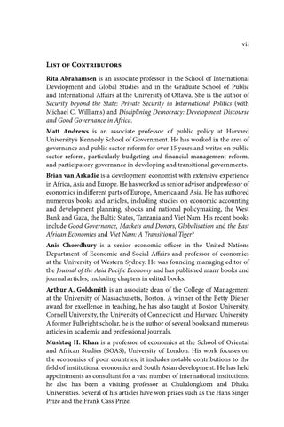 List of Contributors Rita Abrahamsen is an associate professor in the School of International Development and Global Studies and in the Graduate School of Public and International Affairs at the University of Ottawa. She is the author of Security beyond the State: Private Security in International Politics (with Michael C. Williams) and Disciplining Democracy: Development Discourse and Good Governance in Africa. Matt Andrews is an associate professor of public policy at Harvard University’s Kennedy School of Government. He has worked in the area of governance and public sector reform for over 15 years and writes on public sector reform, particularly budgeting and financial management reform, and participatory governance in developing and transitional governments. Brian van Arkadie is a development economist with extensive experience in Africa, Asia and Europe. He has worked as senior advisor and professor of economics in different parts of Europe, America and Asia. He has authored numerous books and articles, including studies on economic accounting and development planning, shocks and national policymaking, the West Bank and Gaza, the Baltic States, Tanzania and Viet Nam. His recent books include Good Governance, Markets and Donors, Globalisation and the East African Economies and Viet Nam: A Transitional Tiger? Anis Chowdhury is a senior economic officer in the United Nations Department of Economic and Social Affairs and professor of economics at the University of Western Sydney. He was founding managing editor of the Journal of the Asia Pacific Economy and has published many books and journal articles, including chapters in edited books. Arthur A. Goldsmith is an associate dean of the College of Management at the University of Massachusetts, Boston. A winner of the Betty Diener award for excellence in teaching, he has also taught at Boston University, Cornell University, the University of Connecticut and Harvard University. A former Fulbright scholar, he is the author of several books and numerous articles in academic and professional journals. Mushtaq H. Khan is a professor of economics at the School of Oriental and African Studies (SOAS), University of London. His work focuses on the economics of poor countries; it includes notable contributions to the field of institutional economics and South Asian development. He has held appointments as consultant for a vast number of international institutions; he also has been a visiting professor at Chulalongkorn and Dhaka Universities. Several of his articles have won prizes such as the Hans Singer Prize and the Frank Cass Prize.