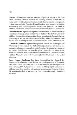 viii Marcus J. Kurtz is an associate professor of political science at the Ohio State University. He has research and teaching interests in the areas of comparative politics, democratization, political economy and development, with a focus on Latin America. His publications have appeared in leading disciplinary and multidisciplinary international journals. His book is entitled Free Market Democracy and the Chilean and Mexican Countryside. Martin Painter is a professor of public administration as well as university coordinator (strategic plan) in the Office of the Provost at the City University of Hong Kong and the director of the Governance in Asia Research Centre. Previously he worked at the University of Sydney, where from 1996 to 2000 he was head of the Department of Government and Public Administration. Andrew M. Schrank is a professor of political science and sociology at the University of New Mexico. He studies the organization, performance and regulation of industry, especially in Latin America. His articles have appeared in various disciplinary and interdisciplinary journals. His forthcoming book (co-authored with Josh Whitford) from Princeton University Press is entitled When Networks Fail: Uncovering Hidden Weaknesses in the Global Economy. Jomo Kwame Sundaram has been Assistant-Secretary-General for Economic Development in the United Nations Department of Economic and Social Affairs since 2005. In 2007, he was awarded the Wassily Leontief Prize. During 2008–9, he served as a member of the [Stiglitz] Commission of Experts on Reforms of the International Monetary and Financial System. He was founder chair of International Development Economics Associates (IDEAs).