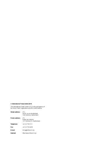 Š International Trade Centre 2015 The International Trade Centre (ITC) is the joint agency of the World Trade Organization and the United Nations. Street address: ITC 54-56, rue de Montbrillant 1202 Geneva, Switzerland Postal address: ITC Palais des Nations 1211 Geneva 10, Switzerland Telephone: