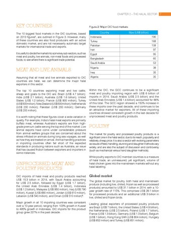 Unprocessed meat and poultry products OIC imports of halal meat and poultry products reached US$ 15.3 billion in 2014, with Saudi Arabia accounting for US$ 2.5 billion, followed by Egypt (US$ 1.7 billion), the United Arab Emirates (US$ 1.4 billion), Indonesia (US$ 1.2 billion), Malaysia (US$ 950 million), Iraq (US$ 790 million), Kuwait (US$ 680 million), Jordan (US$ 610 million), Lebanon (US$ 540 million), and Oman (US$ 510 million)6. Major growth in all 10 importing countries was consistent over a 10-year period, ranging from 103% growth in Kuwait to 495% growth in Indonesia. OIC imports for this product group grew 227% in the past decade.