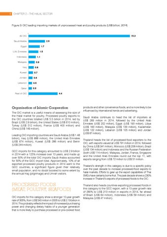 products and other convenience foods, and is more likely to be influenced by international trends and advertising. Saudi Arabia continues to head the list of importers at US$ 269 million in 2014, followed by the United Arab Emirates (US$ 202 million), Egypt (US$ 193 million), Libya (US$ 163 million), Malaysia (US$ 133 million), Kazakhstan (US$ 122 million), Lebanon (US$ 105 million) and Jordan (US$ 87 million). Thailand heads the list of processed-food exporters to the OIC, with exports valued at US$ 791 million in 2014, followed by China (US$ 341 million), Morocco (US$ 208 million), Brazil (US$ 134 million) and Indonesia and the Russian Federation (both US$ 114 million). Malaysia, Jordan, France, Singapore and the United Arab Emirates round out the top 11, with exports ranging from US$ 72 million to US$ 51 million. Thailand’s strength in this category is due to a specific policy over the past decade to increase processed-food exports to halal markets. Efforts to gear up the export capabilities of Thai SMEs have certainly borne fruit. The past decade shows a 230% increase in Thailand’s exports of processed foods to the OIC. Thailand also heads countries exporting processed foods in this category to the GCC region, with a 10-year growth rate of 280% to US$ 213 million in exports in 2014, far ahead of Brazil (US$ 64 million), Indonesia (US$ 59 million) and Malaysia (US$ 47 million).
