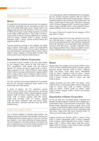Organisation of Islamic Cooperation In the Muslim-majority markets of the OIC, total imports for this category were valued at US$ 50.8 billion in 2014, representing 144% growth over the previous decade. OIC imports are led by Egypt (US$ 5.1 billion), Islamic Republic of Iran (US$ 4.9 billion), Saudi Arabia (US$ 4.7 billion), Indonesia (US$ 3.9 billion), Algeria (US$ 3.6 billion), Turkey (US$ 2.4 billion), Malaysia (US$ 2.2 billion), Nigeria (US$ 2.1 billion), Morocco (US$ 2.1 billion) and Iraq (US$ 1.7 billion). Four OIC countries are among the global top 10 importers, and the OIC countries collectively import 35.6% of the world’s grain and cereal exports. In terms of exports, the OIC collectively exports US$ 6.7 billion of grain and cereal products, comprising 4.4% of the total export market. Leading exporters include Pakistan (US$ 2.4 billion), Kazakhstan (US$ 1.7 billion), Turkey (US$ 1.2 billion), Guyana (US$ 240 million), United Arab Emirates (US$ 177 million), Uganda (US$ 148 million), Malaysia (US$ 109 million), Egypt, (US$ 108 million), Indonesia (US$ 86 million) and Oman (US$ 82 million).