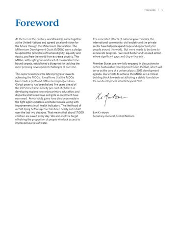 Foreword At the turn of the century, world leaders came together at the United Nations and agreed on a bold vision for the future through the Millennium Declaration. The Millennium Development Goals (MDGs) were a pledge to uphold the principles of human dignity, equality and equity, and free the world from extreme poverty. The MDGs, with eight goals and a set of measurable timebound targets, established a blueprint for tackling the most pressing development challenges of our time. This report examines the latest progress towards achieving the MDGs. It reaffirms that the MDGs have made a profound difference in people’s lives. Global poverty has been halved five years ahead of the 2015 timeframe. Ninety per cent of children in developing regions now enjoy primary education, and disparities between boys and girls in enrolment have narrowed. Remarkable gains have also been made in the fight against malaria and tuberculosis, along with improvements in all health indicators. The likelihood of a child dying before age five has been nearly cut in half over the last two decades. That means that about 17,000 children are saved every day. We also met the target of halving the proportion of people who lack access to improved sources of water.