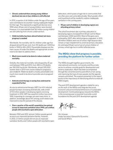 •• Chronic undernutrition among young children declined, but one in four children is still affected In 2012, a quarter of all children under the age of five years were estimated to be stunted—having inadequate height for their age. This represents a significant decline since 1990 when 40 per cent of young children were stunted. However, it is unacceptable that 162 million young children are still suffering from chronic undernutrition. •• Child mortality has been almost halved, but more progress is needed Worldwide, the mortality rate for children under age five dropped almost 50 per cent, from 90 deaths per 1,000 live births in 1990 to 48 in 2012. Preventable diseases are the main causes of under-five deaths and appropriate actions need to be taken to address them. •• Much more needs to be done to reduce maternal mortality Globally, the maternal mortality ratio dropped by 45 per cent between 1990 and 2013, from 380 to 210 deaths per 100,000 live births. Worldwide, almost 300,000 women died in 2013 from causes related to pregnancy and childbirth. Maternal death is mostly preventable and much more needs to be done to provide care to pregnant women. •• Antiretroviral therapy is saving lives and must be expanded further Access to antiretroviral therapy (ART) for HIV-infected people has been increasing dramatically, with a total of 9.5 million people in developing regions receiving treatment in 2012. ART has saved 6.6 million lives since 1995. Expanding its coverage can save many more. In addition, knowledge about HIV among youth needs to be improved to stop the spread of the disease.