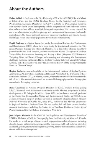 About the Authors Deborah Balk is Professor at the City University of New York (CUNY)’s Baruch School of Public Affairs and the CUNY Graduate Center (in the Sociology and Economics Programs) and Associate Director of the CUNY Institute for Demographic Research. Her expertise lies in spatial demography and the integration of earth and social science data and methods to address interdisciplinary policy questions. Her current research focus is on urbanization, population, poverty, and environmental interactions (such as climate change). She has co-authored numerous papers on population and climate change, including a recent one on city population forecasts and water scarcity. David Dodman is a Senior Researcher at the International Institute for Environment and Development (IIED) where he is team leader for institutional objectives on ‘Cities and Climate Change’ and ‘Research Quality’. He is the author of more than thirty journal articles and book chapters, and the co-editor of ‘Global Change and Caribbean Vulnerability: Environment, Economy and Society at Risk’ (Kingston, UWI Press) and ‘Adapting Cities to Climate Change: understanding and addressing the development challenge’ (London, Earthscan). He is a College Teaching Fellow at University College London, and a Lead Author on the Fifth Assessment Report of the Intergovernmental Panel on Climate Change. Regina Fuchs is a research scholar at the International Institute of Applied Systems Analysis (IIASA), as well as a Teaching and Research Associate at the University of Economics and Business (WU) in Vienna, Austria, where she was awarded a doctorate in the fall of 2012. Her research is focused on household demography and the demographic transition in developing countries. Boris Graizbord is National Program Director for LEAD Mexico. Before joining LEAD, he served twice as academic coordinator for the Master’s programme in urban development at El Colegio de México. Since 1979, he has been a research professor at the Center for Demographic, Urban and Environmental Studies at El Colegio de México; lecturer in the post-graduate division in the faculty of architecture at Mexico’s National University (UNAM); and, since 1992, lecturer in the Master’s programme in Regional Studies at Instituto Mora. He also teaches full and short courses in other academic institutions, including the University of Southern California, University of Pennsylvania and the New School University in New York. José Miguel Guzmán is the Chief of the Population and Development Branch of UNFPA. He holds a Ph.D. in Demography from the University of Montreal, Canada. He works on a wide range of issues related to population and development, including climate change, urbanization, ageing, fertility transition, child and maternal mortality and health, gender, international migration, poverty, natural disaster impacts and surveys/ census and information systems. xii