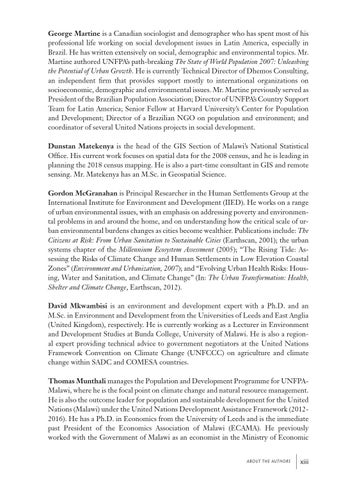 George Martine is a Canadian sociologist and demographer who has spent most of his professional life working on social development issues in Latin America, especially in Brazil. He has written extensively on social, demographic and environmental topics. Mr. Martine authored UNFPA’s path-breaking The State of World Population 2007: Unleashing the Potential of Urban Growth. He is currently Technical Director of Dhemos Consulting, an independent firm that provides support mostly to international organizations on socioeconomic, demographic and environmental issues. Mr. Martine previously served as President of the Brazilian Population Association; Director of UNFPA’s Country Support Team for Latin America; Senior Fellow at Harvard University’s Center for Population and Development; Director of a Brazilian NGO on population and environment; and coordinator of several United Nations projects in social development. Dunstan Matekenya is the head of the GIS Section of Malawi’s National Statistical Office. His current work focuses on spatial data for the 2008 census, and he is leading in planning the 2018 census mapping. He is also a part-time consultant in GIS and remote sensing. Mr. Matekenya has an M.Sc. in Geospatial Science. Gordon McGranahan is Principal Researcher in the Human Settlements Group at the International Institute for Environment and Development (IIED). He works on a range of urban environmental issues, with an emphasis on addressing poverty and environmental problems in and around the home, and on understanding how the critical scale of urban environmental burdens changes as cities become wealthier. Publications include: The Citizens at Risk: From Urban Sanitation to Sustainable Cities (Earthscan, 2001); the urban systems chapter of the Millennium Ecosystem Assessment (2005); “The Rising Tide: Assessing the Risks of Climate Change and Human Settlements in Low Elevation Coastal Zones” (Environment and Urbanization, 2007); and “Evolving Urban Health Risks: Housing, Water and Sanitation, and Climate Change” (In: The Urban Transformation: Health, Shelter and Climate Change, Earthscan, 2012). David Mkwambisi is an environment and development expert with a Ph.D. and an M.Sc. in Environment and Development from the Universities of Leeds and East Anglia (United Kingdom), respectively. He is currently working as a Lecturer in Environment and Development Studies at Bunda College, University of Malawi. He is also a regional expert providing technical advice to government negotiators at the United Nations Framework Convention on Climate Change (UNFCCC) on agriculture and climate change within SADC and COMESA countries. Thomas Munthali manages the Population and Development Programme for UNFPAMalawi, where he is the focal point on climate change and natural resource management. He is also the outcome leader for population and sustainable development for the United Nations (Malawi) under the United Nations Development Assistance Framework (20122016). He has a Ph.D. in Economics from the University of Leeds and is the immediate past President of the Economics Association of Malawi (ECAMA). He previously worked with the Government of Malawi as an economist in the Ministry of Economic abo ut t h e aut h o rs